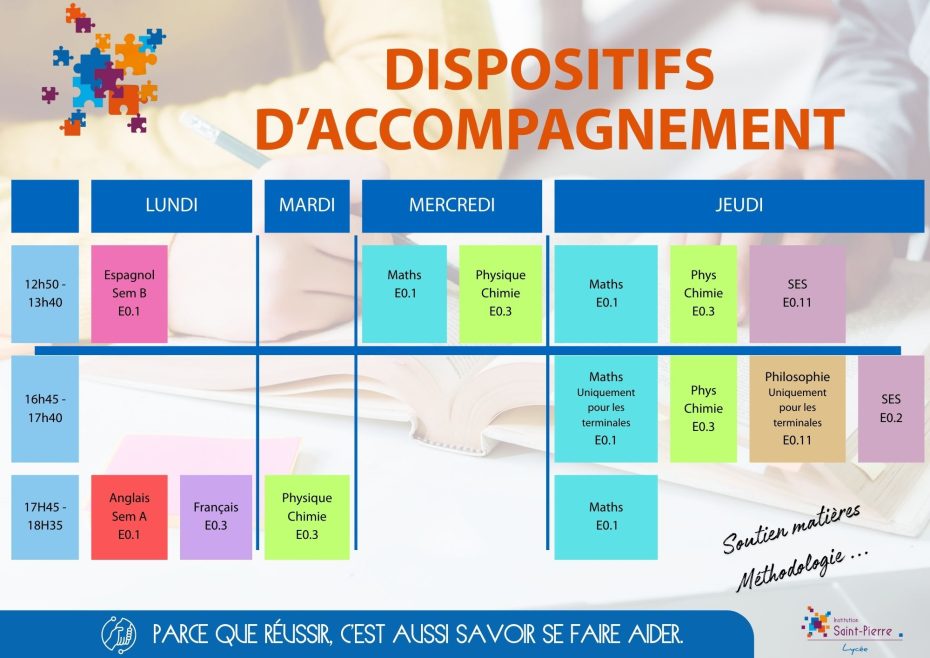 Afin de favoriser l’accompagnement des élèves, des professeurs assurent une présence dans des salles de classe durant la pause méridienne ainsi que pendant certaines heures de permanence ou en fin de journée.